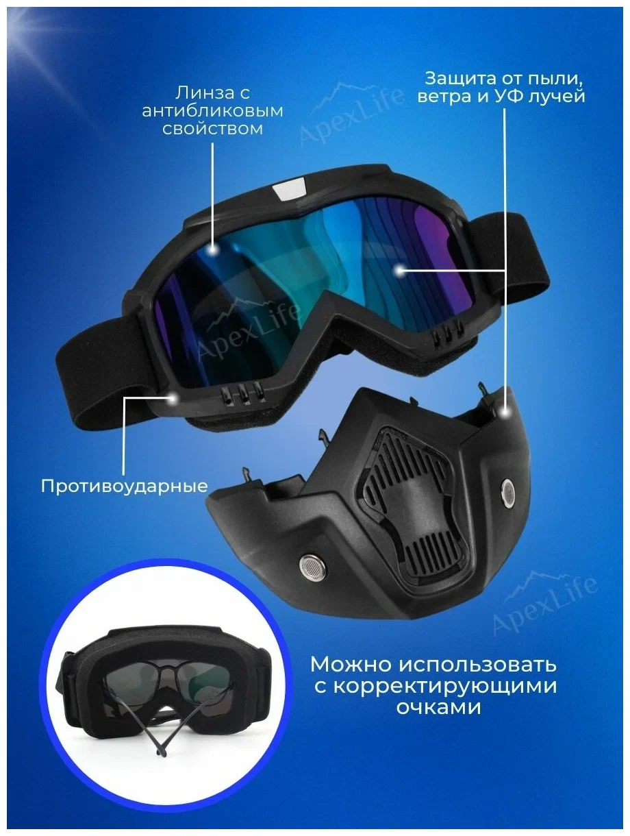 Очки-маска предназначены для горнолыжного, мото и вело спорта, их так же можно использовать для занятий активными и экстремальными видами спорта: сноуборда, скейтборда, квадроцикла, снегохода. Линзы маски обладают отличным обзором и хорошей защитой от солнечных бликов, грязи, снега. Оправа вентилируемая. Наличие вспененного уплотнителя обеспечивает максимальное прилегание маски и защиту глаз от попадания пыли. Нижняя часть маски съемная. Длина ремешка регулируется, что позволяет использовать маску как самостоятельно, так и с большинством видов шлемов.